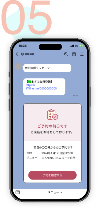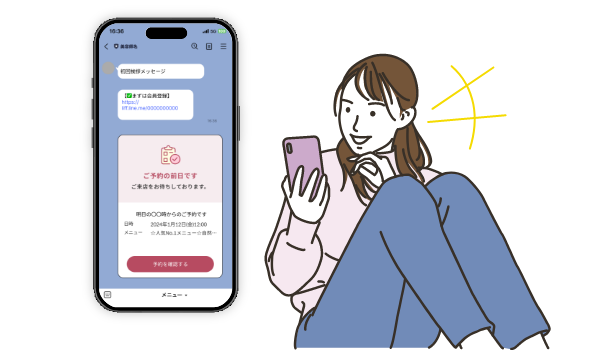 お客様のLINEへ来店前日にメッセージが自動配信!