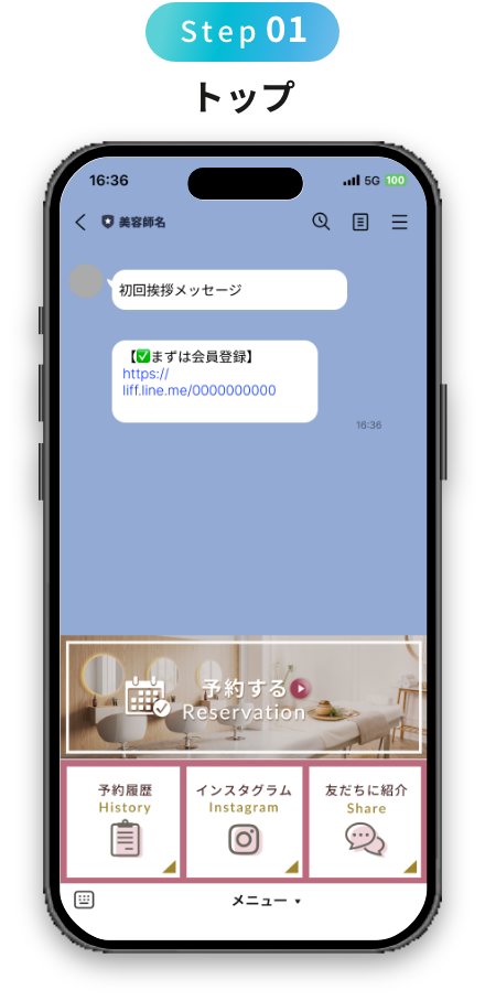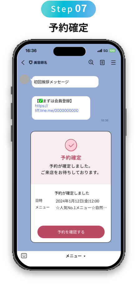 予約前日にお客様へリマインドメッセージが配信されるためにドタキャン防止につながります。